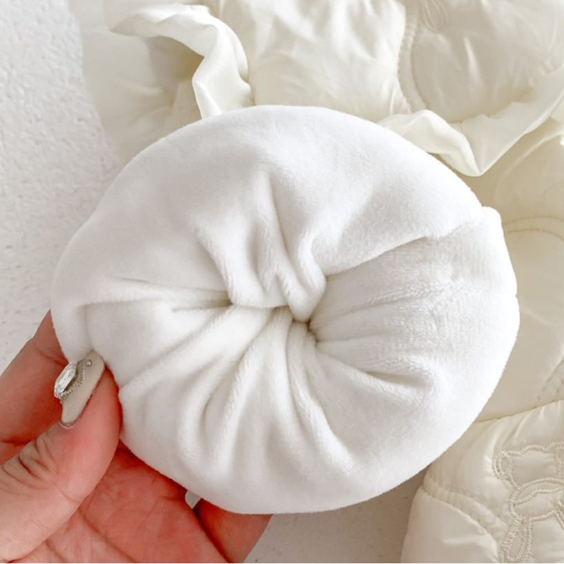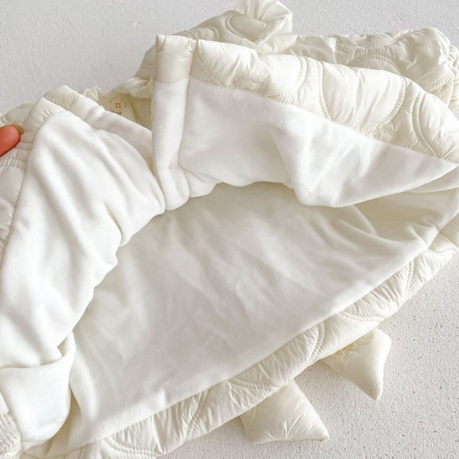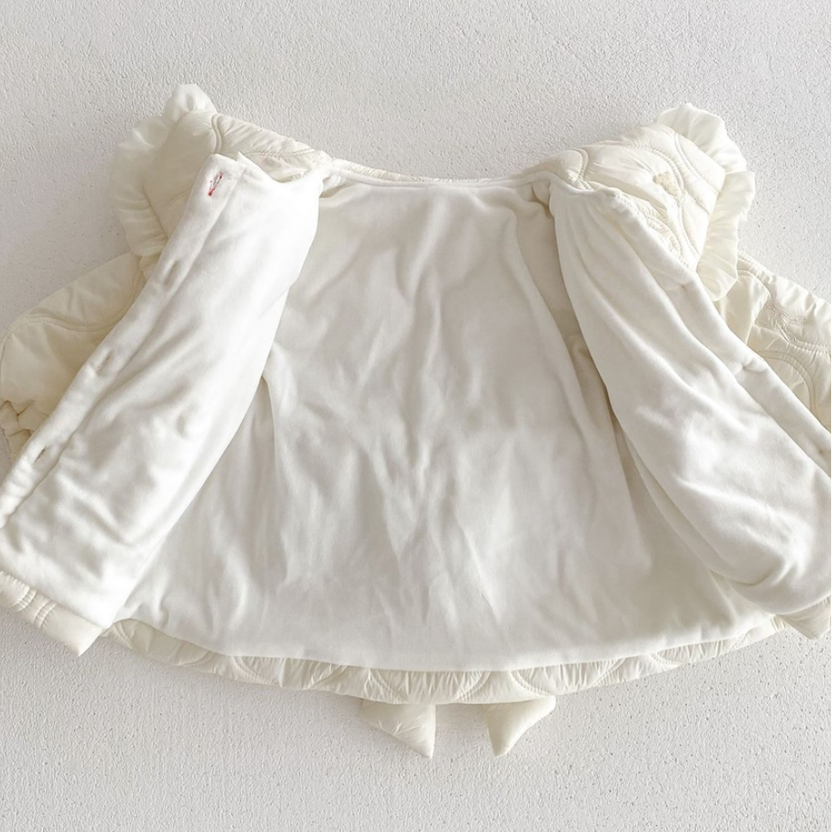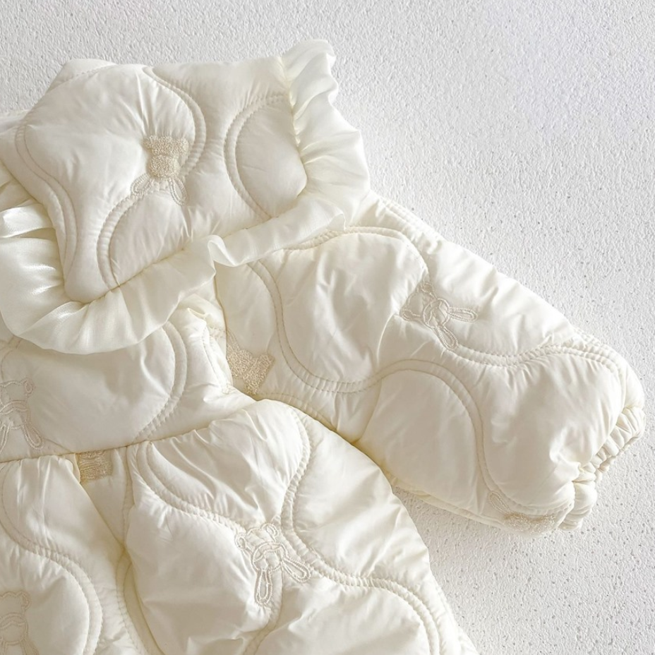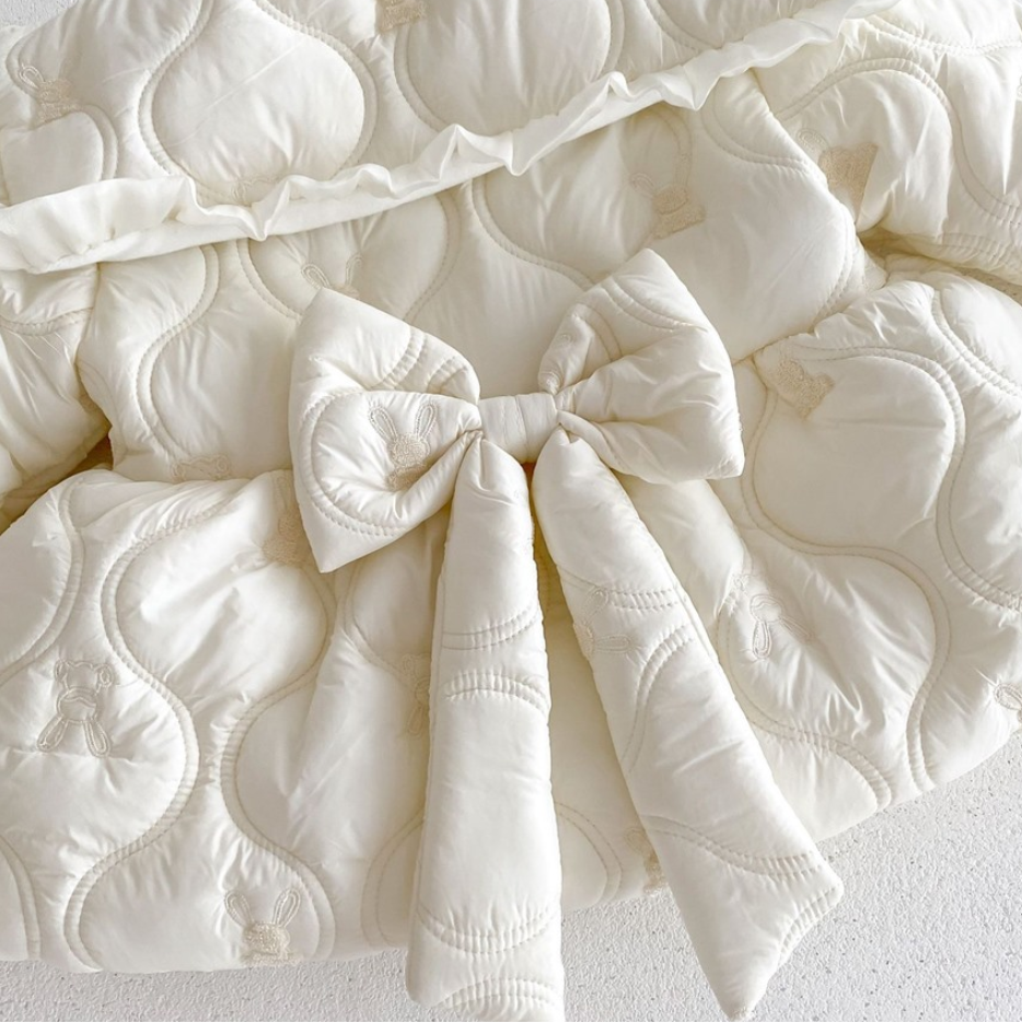 The Big Bow Rabbit Padded Outerwear is a bright and charming piece designed for warmth and style. This light ivory padded jacket, which falls to a dress-like length, features a cozy lining and delightful details, making it a perfect outerwear choice for your little one.