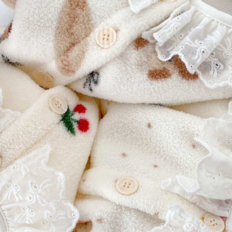 The Fleece Button-Up Pajama Set is the perfect cozy solution for sleep and lounging, combining the classic comfort of button-up pajamas with soft, warm fleece. These sets feature an ivory base with playful patterns and delicate lace details, ensuring warmth and cuteness throughout the night.