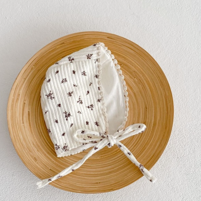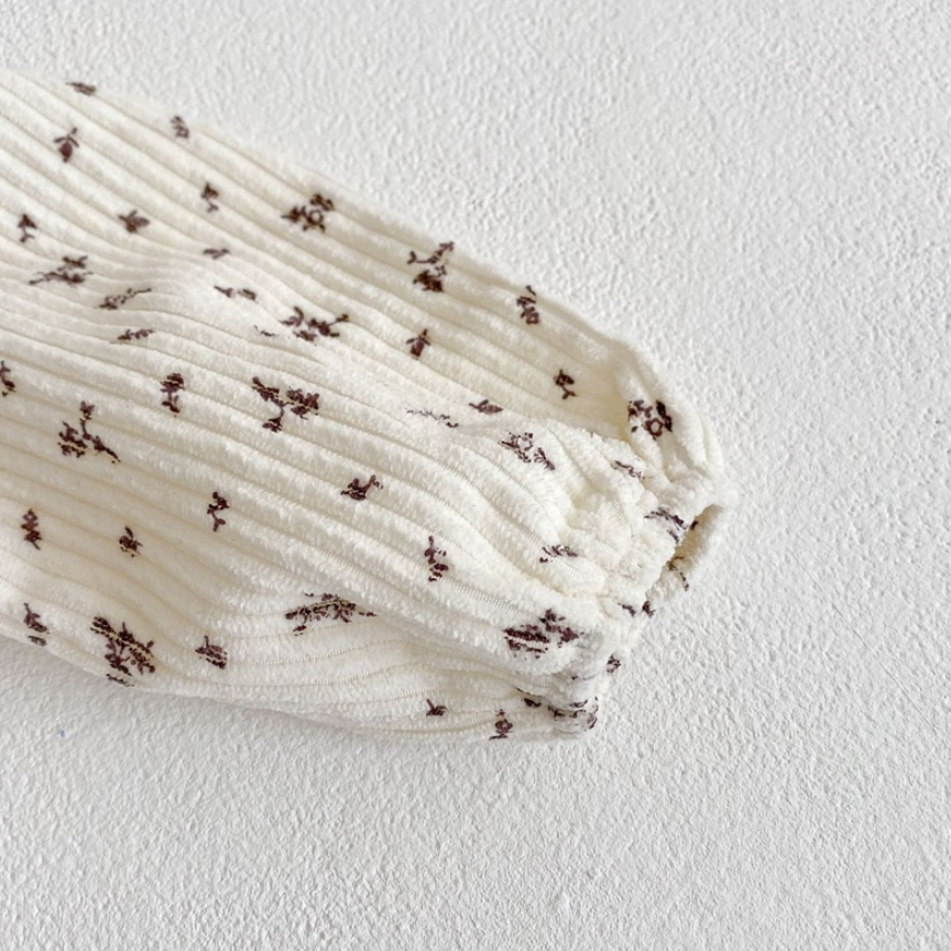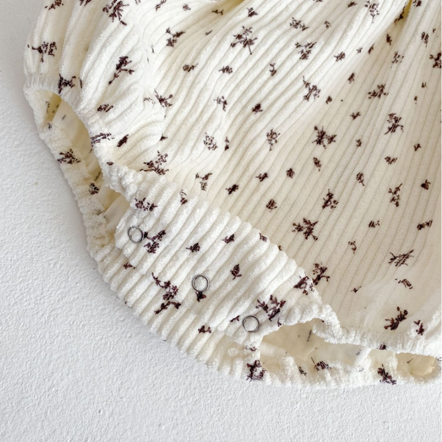 The Flower Corduroy Romper and Bonnet Set brings a touch of vintage sweetness to your baby's style. This lovely set features a bright ivory corduroy fabric adorned with a charming, small-scale dark brown floral pattern. The soft texture and matching bonnet create an irresistibly lovely and cozy look.