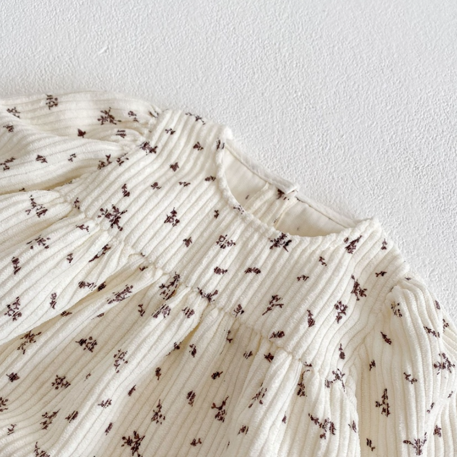 Design Highlight: Warm corduroy material in bright ivory, featuring a delicate dark brown floral print.