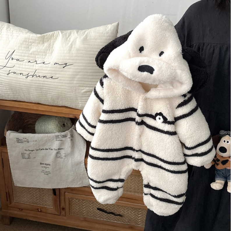 Turn your baby into the cutest pup with the Snuggle Pup Fleece Jumpsuit! This cozy outfit is made from a warm fleece material, perfect for keeping your little one warm and comfortable during chilly days. The adorable dog-themed design will bring a smile to everyone's face.