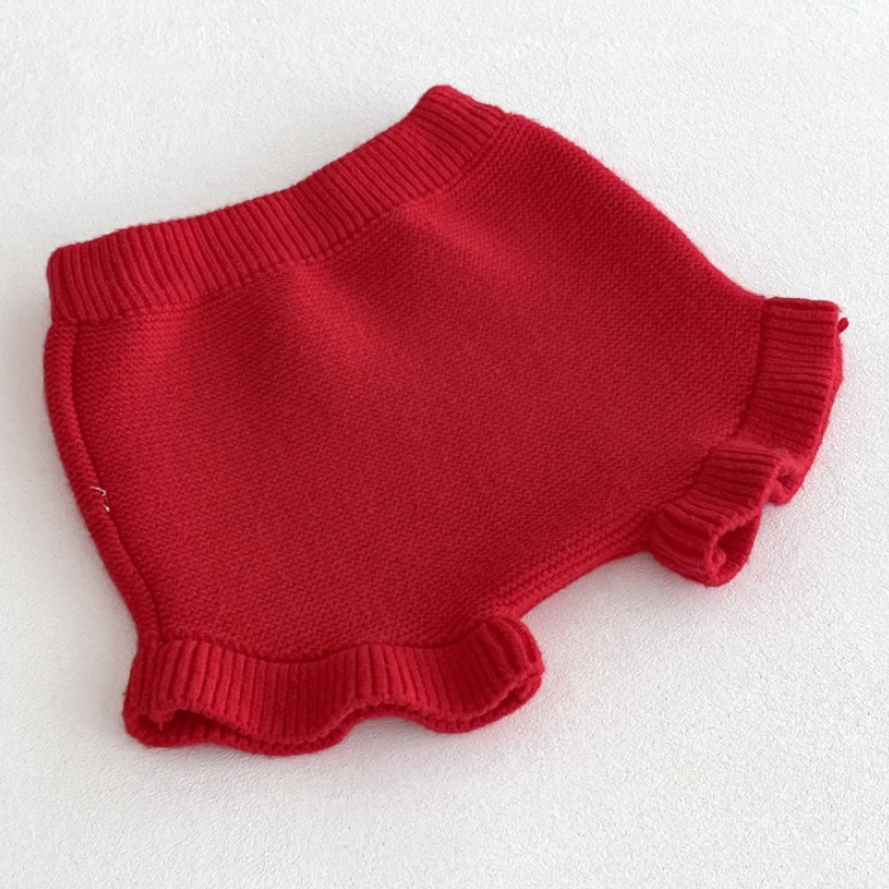 Set Components: Includes a knit cardigan and red shorts with a subtle lace trim at the hem.