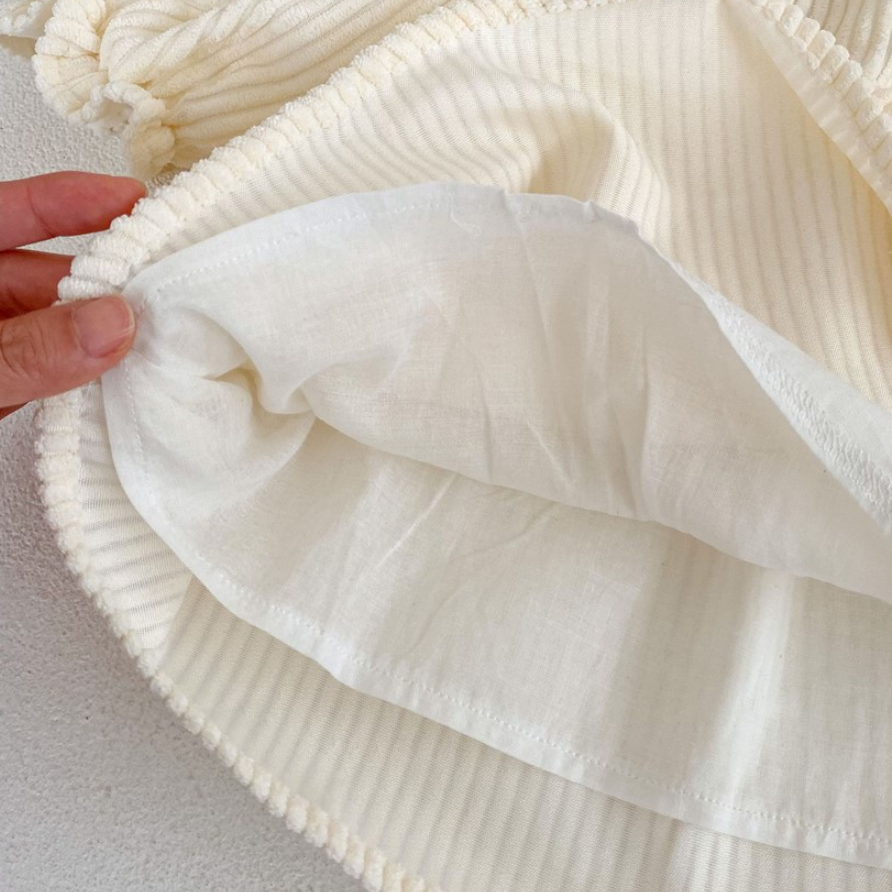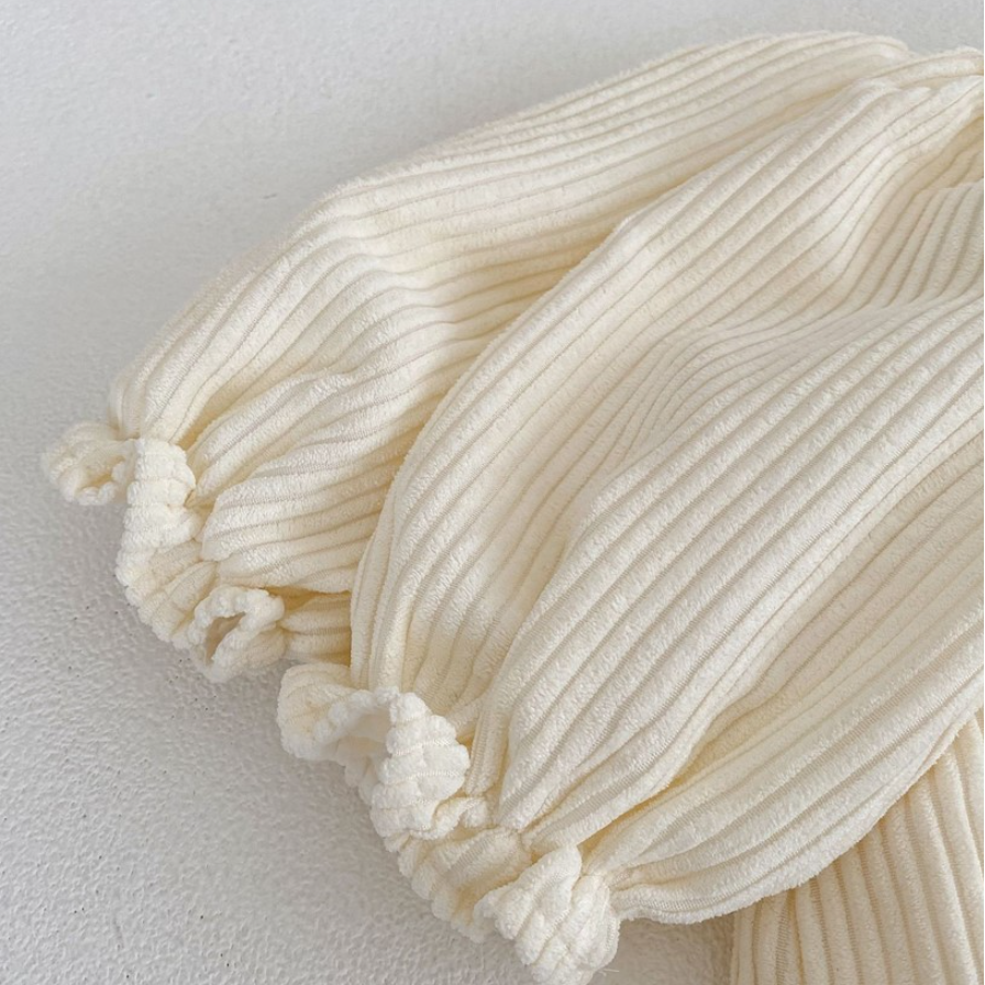 Design Highlight: Charming ivory corduroy dress with delicate floral embroidery.